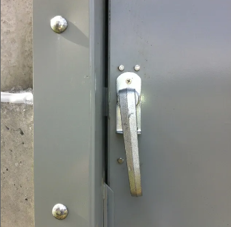 - Door has steel frame with 1/4" plate steel welded to 1"x 3" subframe with 3 latch points operated by 1 handle. The heavy duty door swings only to the inside, allowing you to open the door if an object blocks the front of the door. The door handle will lock and unlock with a single motion.